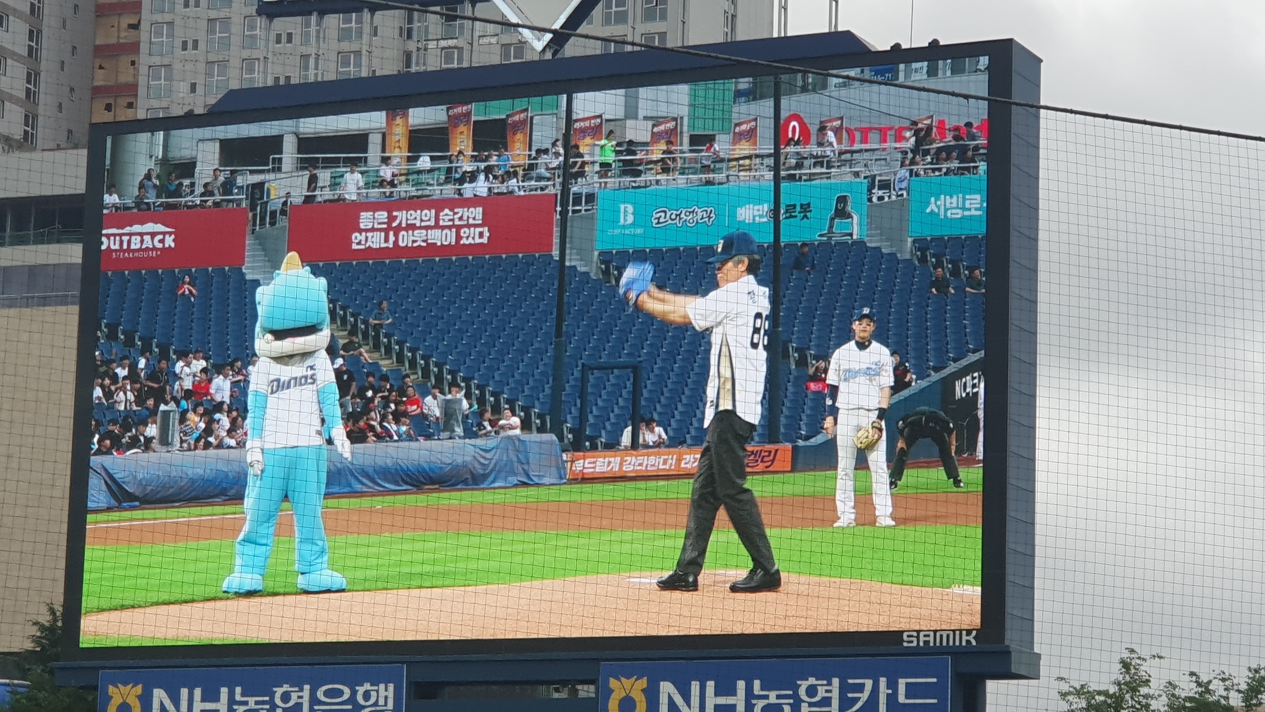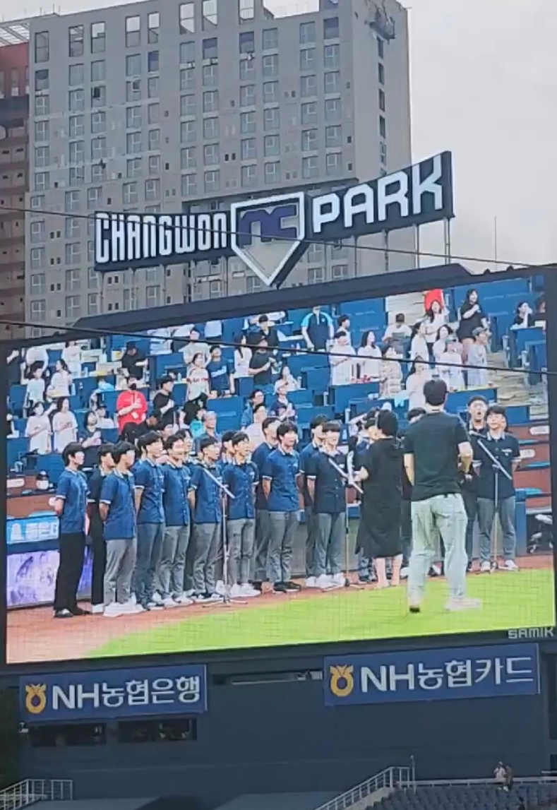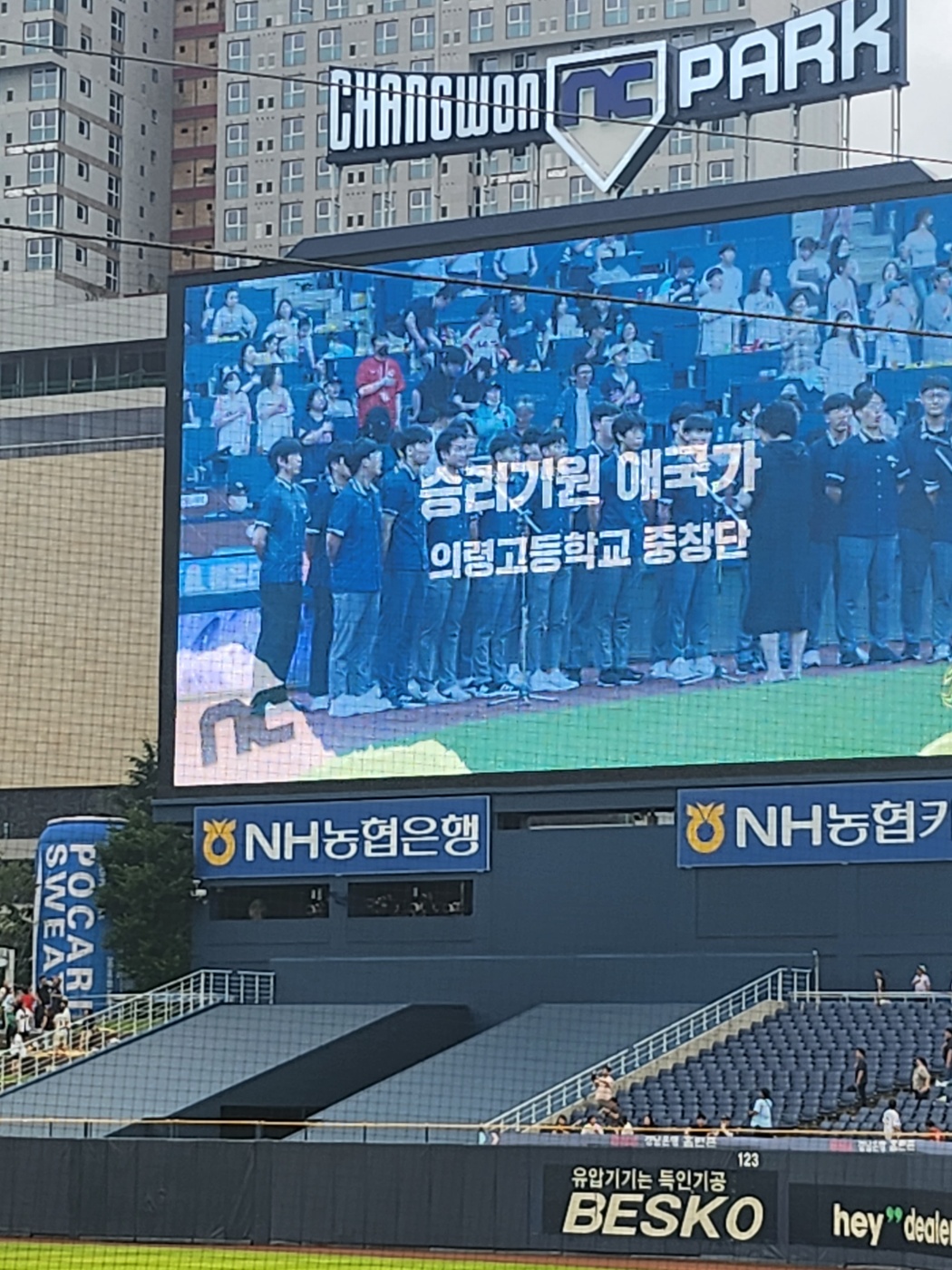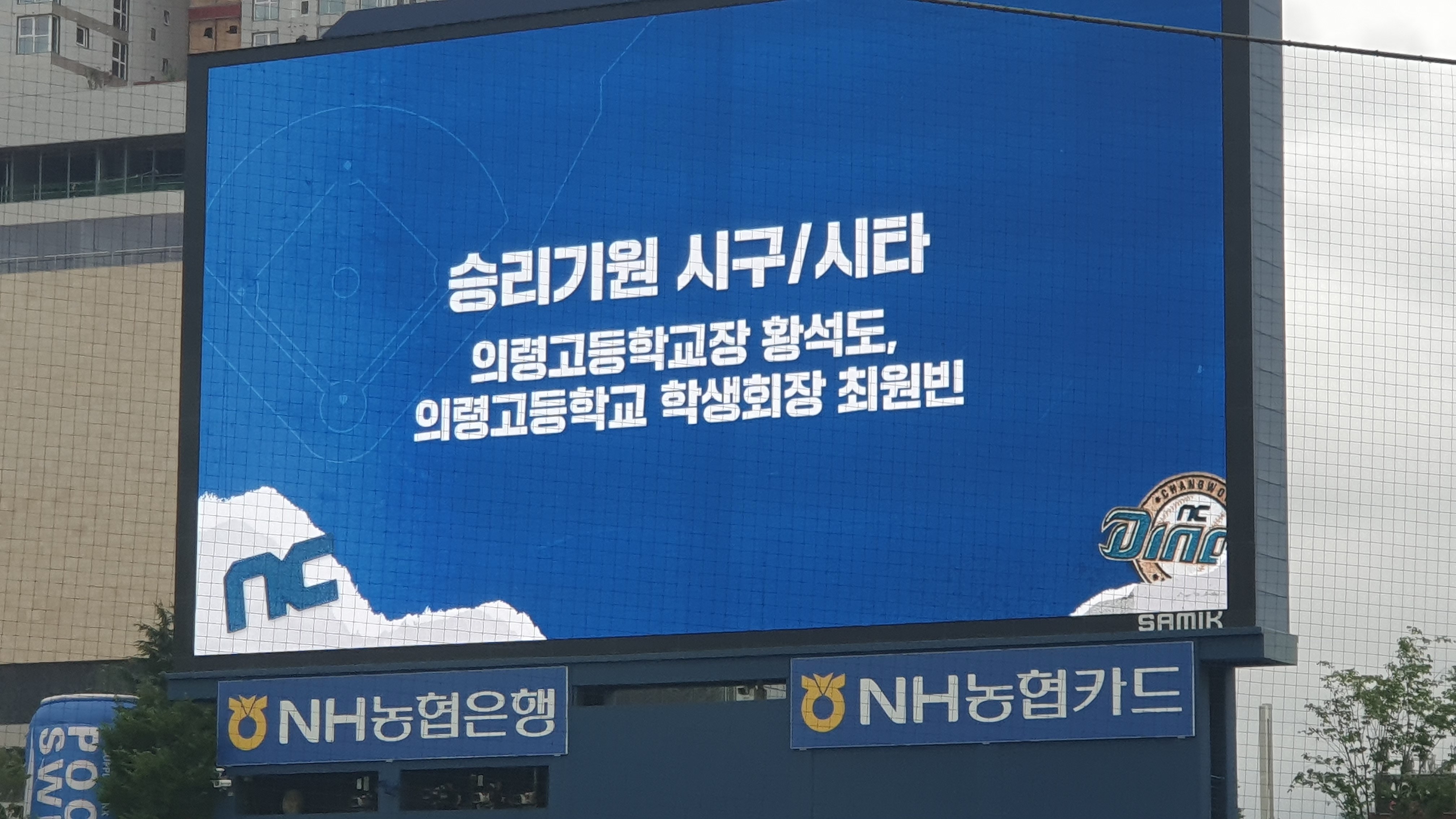 주우재 학생 외 19명의 학생들로 이루어진 의령고 중창단의 애국가 제창 후 황석도 교장선생님의 시구와 최원빈 학생회장의 시타가 있었습니다. 야구장 전광판에 의령고 홍보동영상도 송출하였습니다.