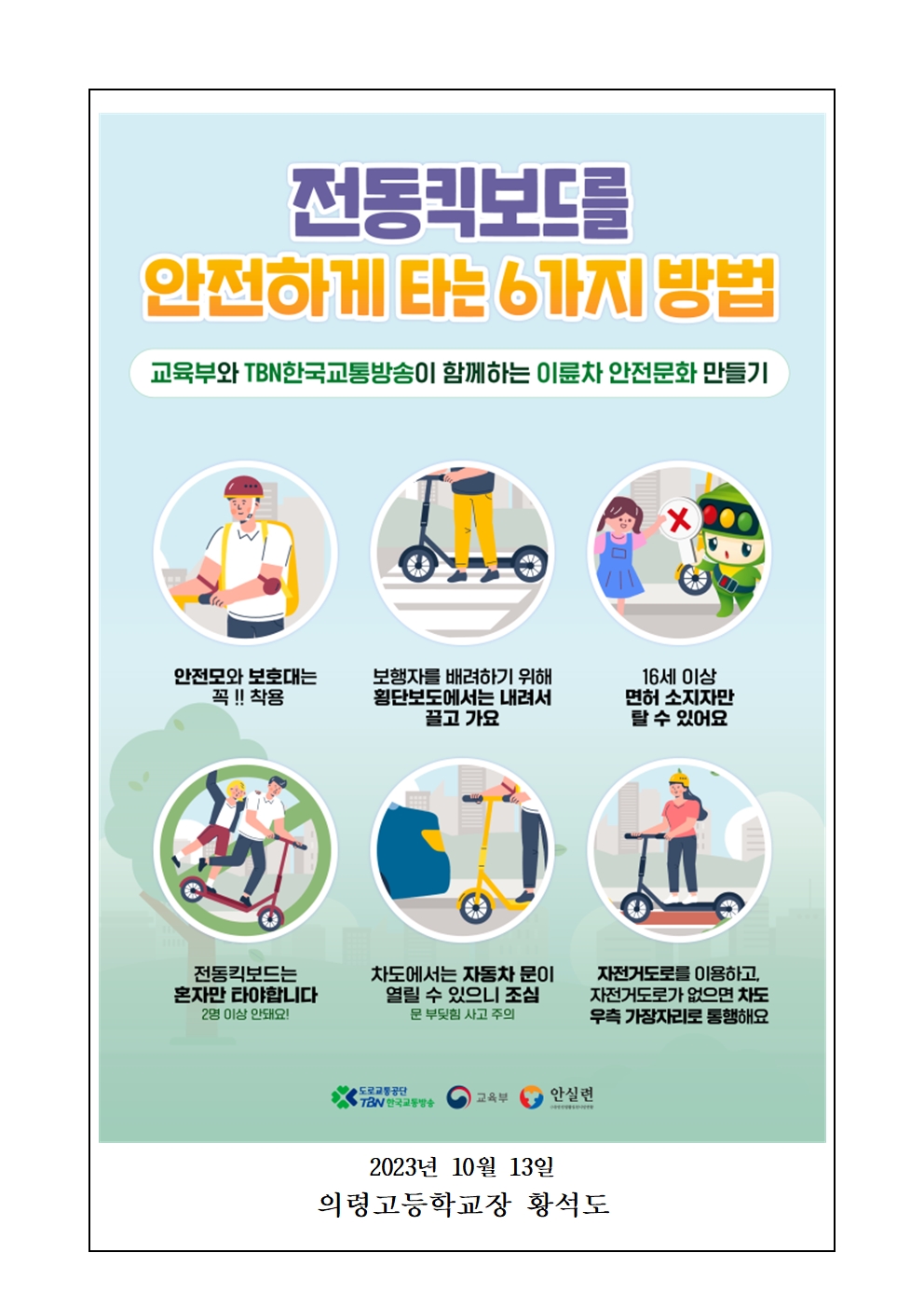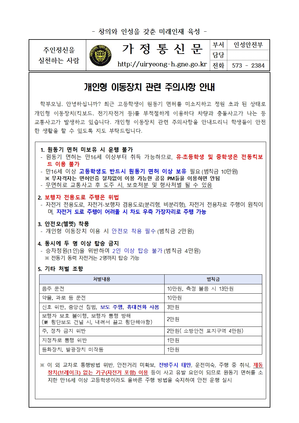 개인형 이동장치 관련 주의사항 안내 가정통신문