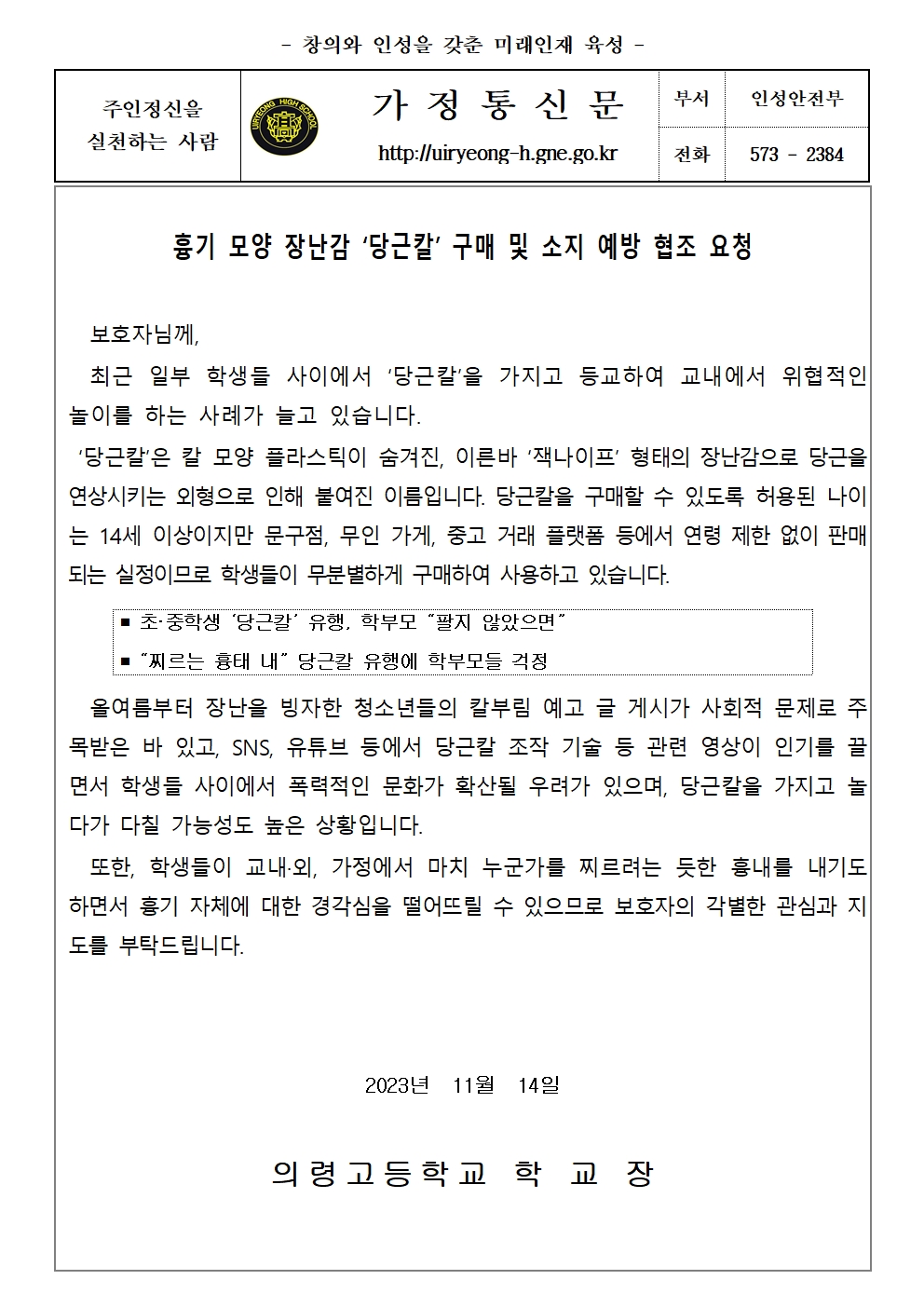흉기모양 장난감(당근칼) 유행 관련 학생생활지도