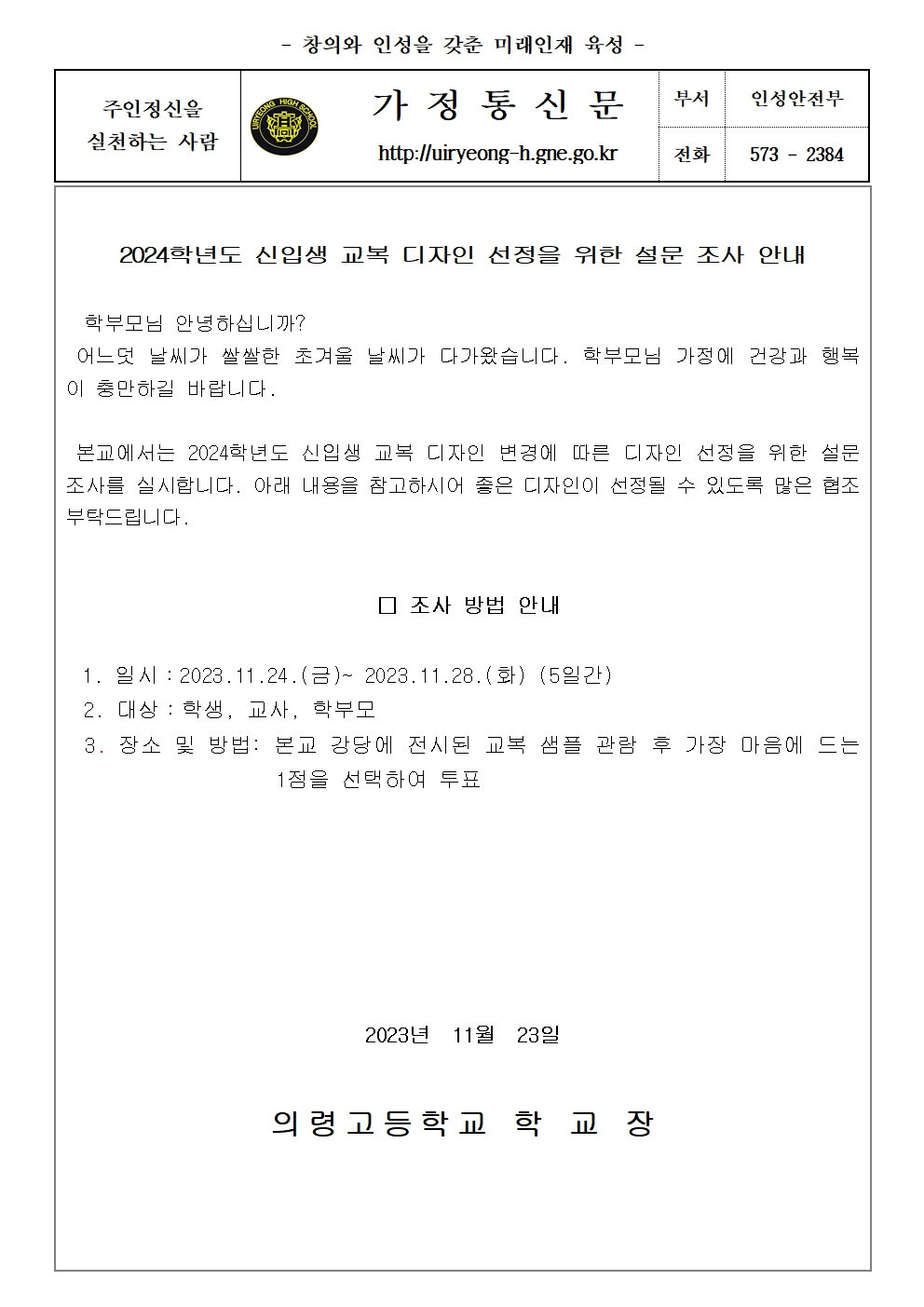 2024학년도 신입생 교복 디자인 선정을 위한 설문 조사 안내