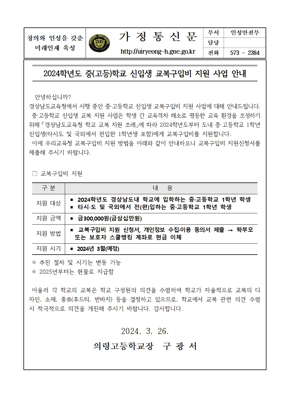 2024학년도 중(고등)학교 신입생 교복구입비 지원 사업 안내 가정통신문