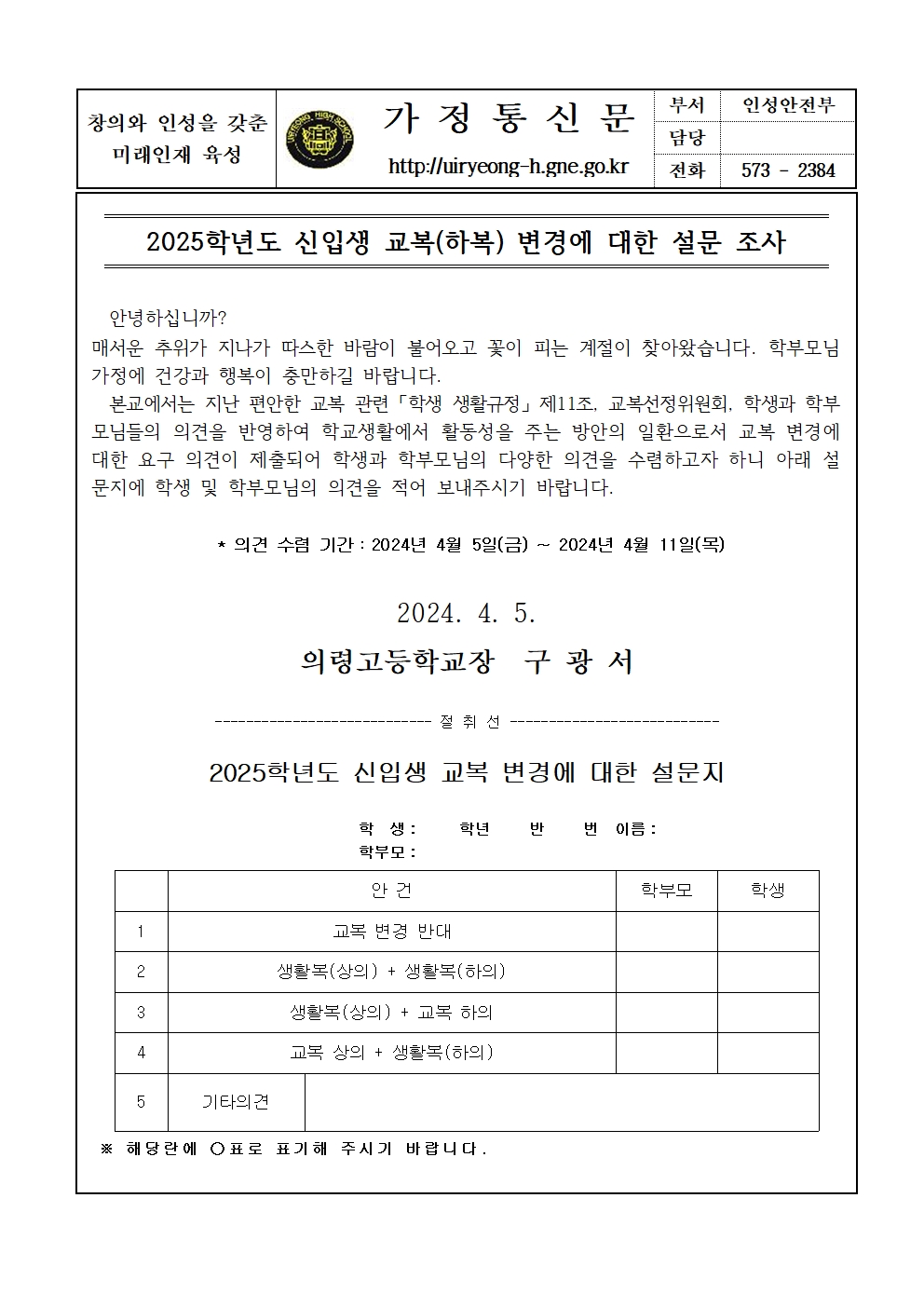2025학년도 신입생 교복(하복) 변경에 대한 설문조사 가정통신문