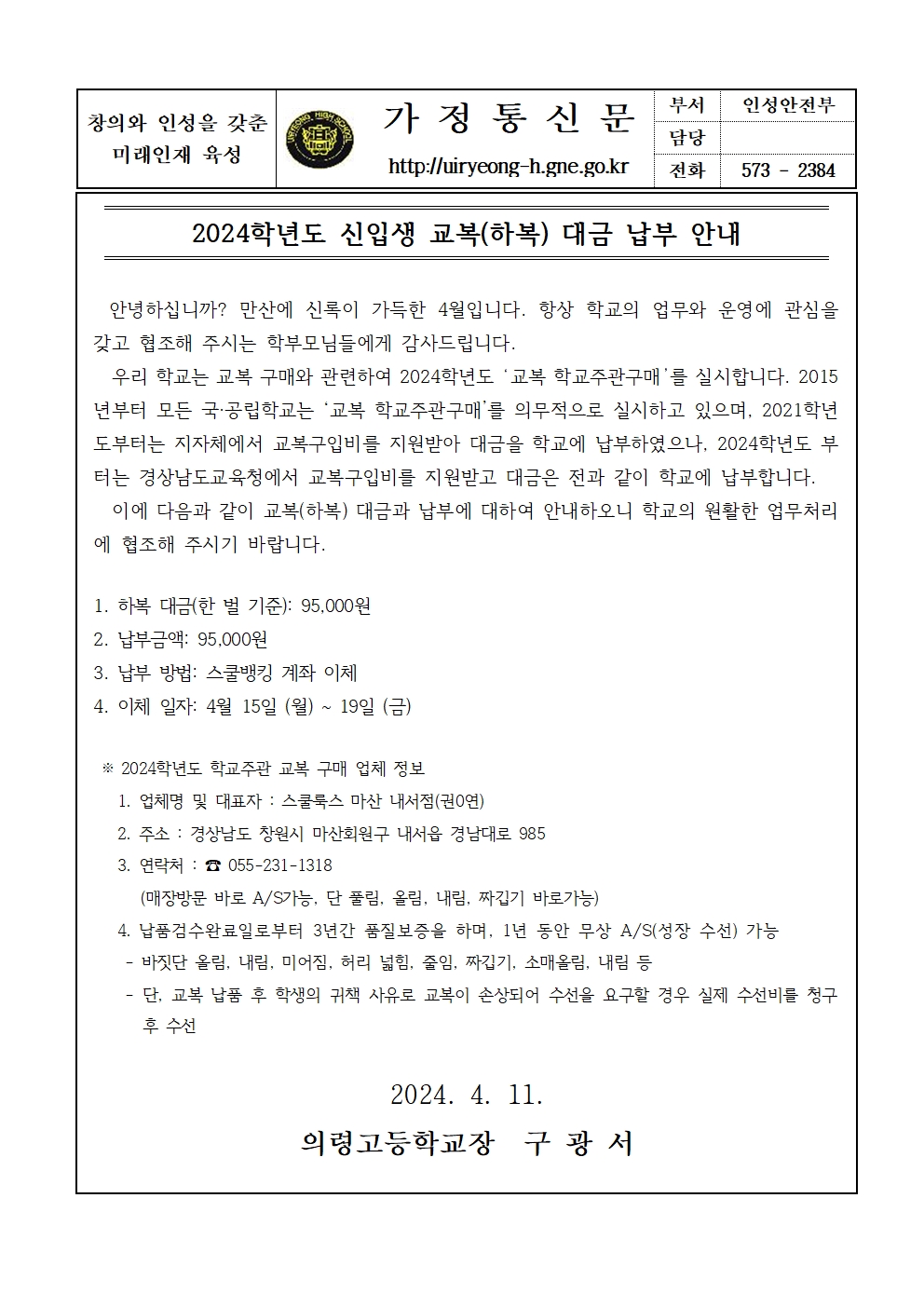 2024학년도 신입생 교복(하복) 대금 납부 안내 가정통신문