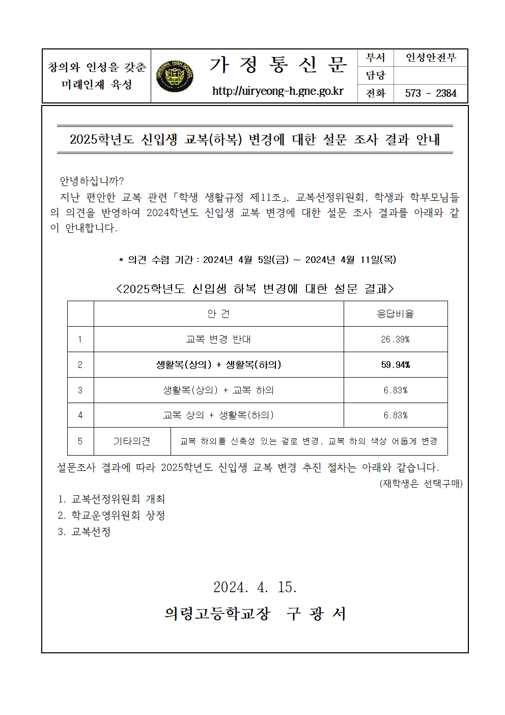 2025학년도 신입생 교복(하복) 변경에 대한 설문조사 결과 안내 가정통신문