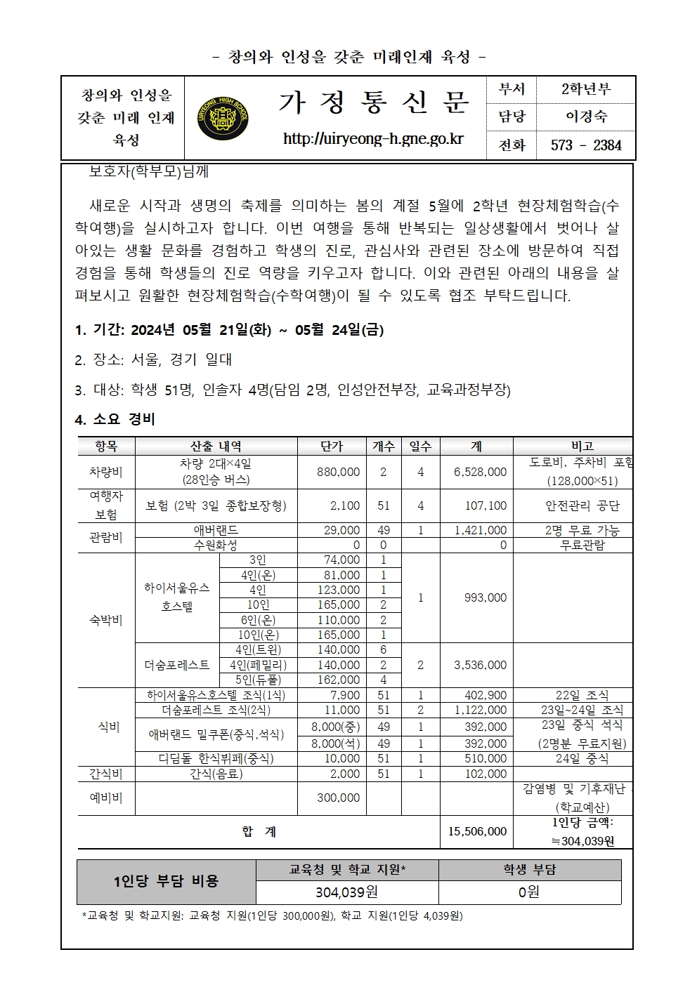 현장체험학습(수학여행) 안내