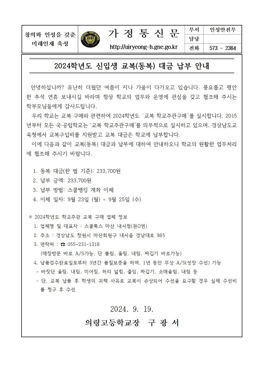 2024학년도 신입생 교복(동복) 대금 납부 안내 가정통신문