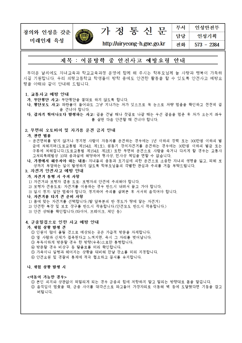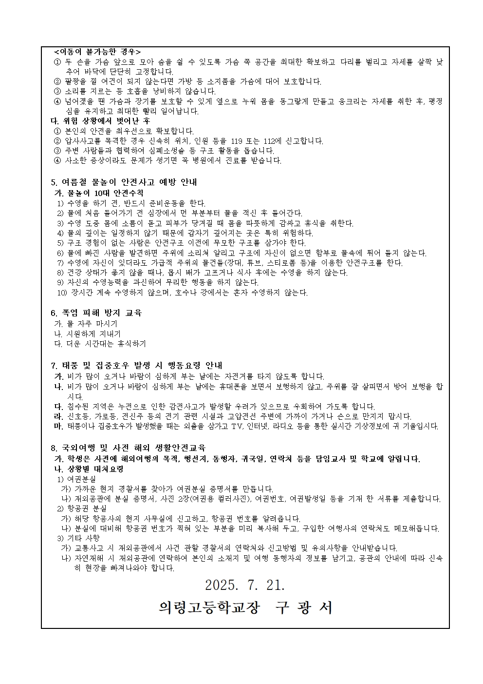여름방학 중 건전한 생활을 위한 행동요령 안내