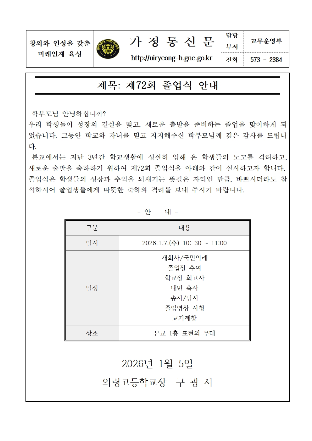 제72회 졸업식 안내 가정통신문.hwp