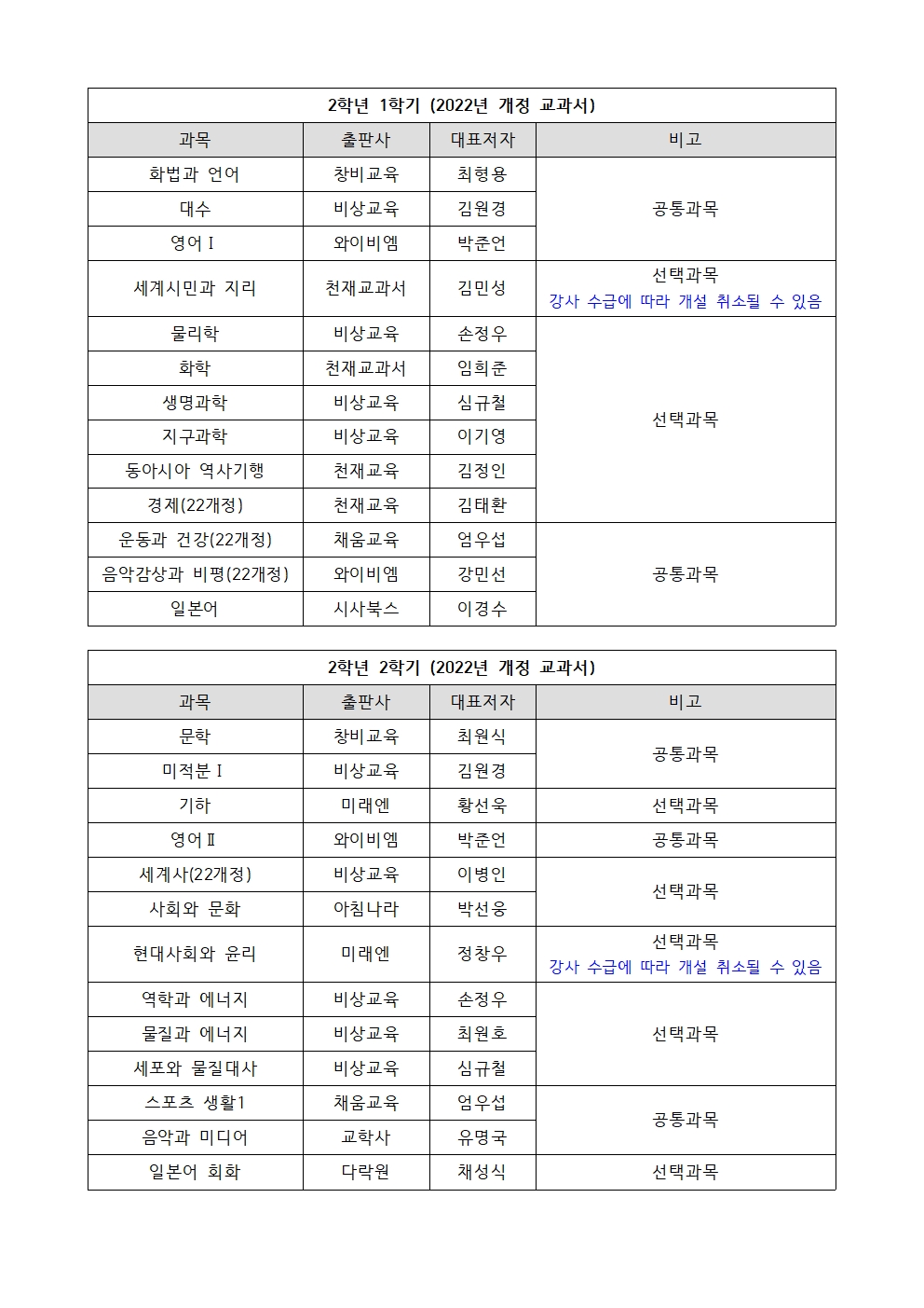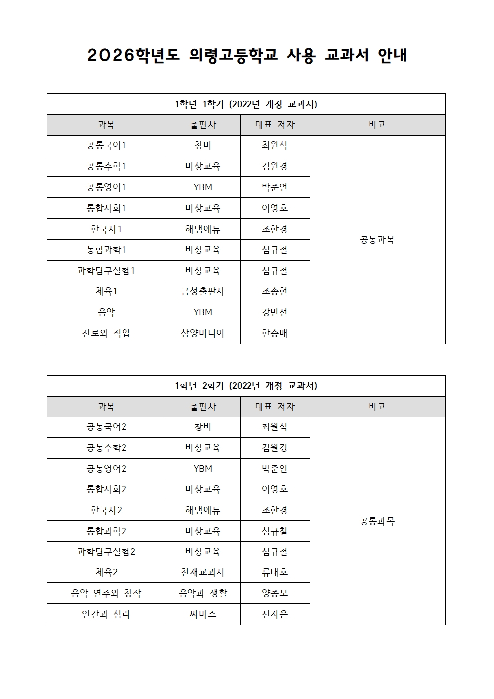 2026학년도에 사용될 과목별 교과서의 출판사 및 저자 안내드립니다.